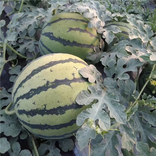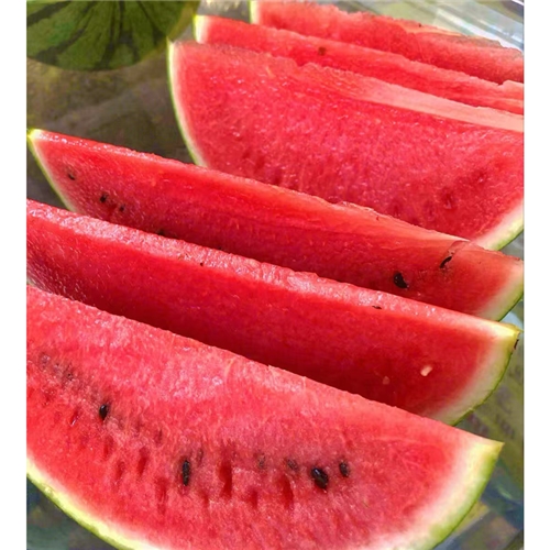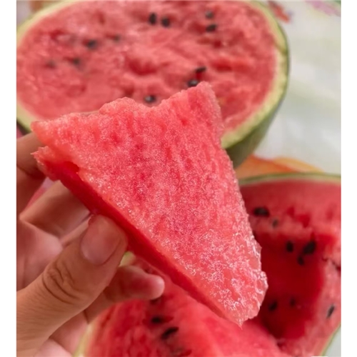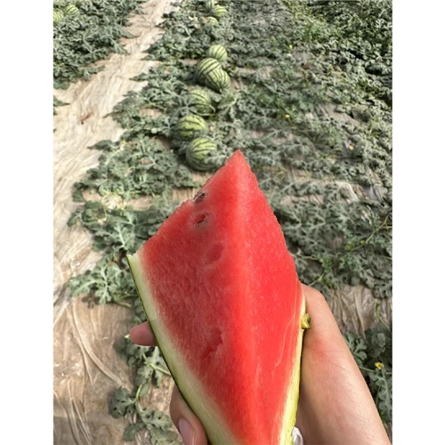 新育成的甜王类型新品种,植株长势稳健,果实发育 32天左右,大果型、果实椭圆,果肉鲜红、瓜码密。易座瓜,不畸形,不易裂瓜,座瓜整齐一致,耐低温弱光,易管理。中心糖度高可达 13度以上,单瓜重10 公斤左右,亩产万斤左右。脆甜细腻爽口,高品质,耐运输。