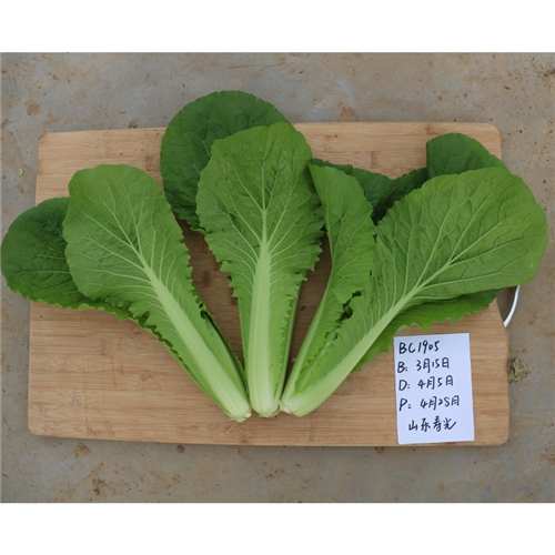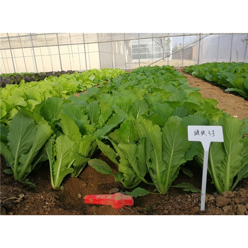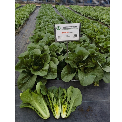 苗用绿帮白菜(快菜) 一代杂交种。株型直立、紧凑、叶色鲜绿,叶面平、无茸毛。叶片圆,叶缘全缘无齿,叶柄较平、绿色;夏季及早秋栽培 25 天即可采收上市,冬春季栽培颜色和株型更佳。