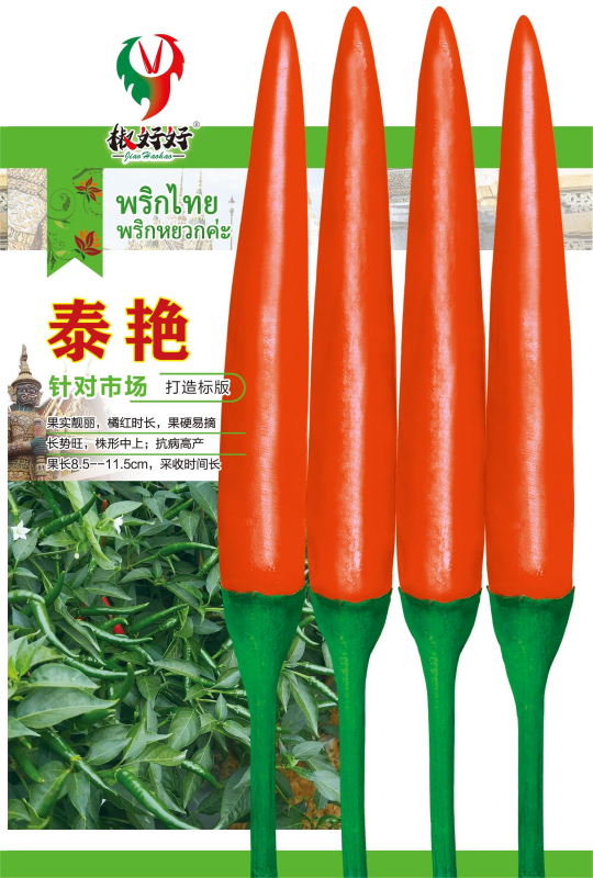 针对市场,打造标版,果实靓丽、株型中上、果硬易摘、长势旺、株型中上;抗病高产、果长8.5-11.5厘米、采收时间长